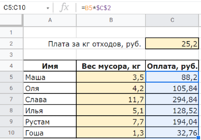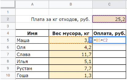 Предположим, группа юных экологов собирает пластиковый мусор в своём районе. Позже папа Маши отвозит собранное в пункт приёма и получает оплату. Чтобы избежать ручных расчётов, они решили создать электронную таблицу, которая будет автоматически пересчитывать, сколько денег полагается ребятам, если изменится стоимость за килограмм.