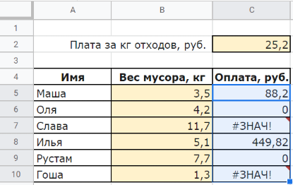 Например, у Оли формула в ячейке C6 — B6*C3, а в C3 ничего нет, в результате чего рассчитывается 0. У Славы формула приводит к ошибке, так как число умножается на текстового значения в заголовке таблицы.