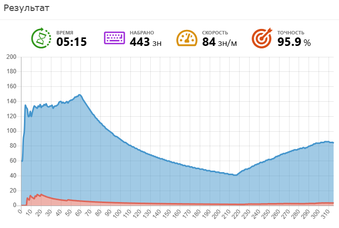 По окончании времени вы увидите свой результат. Синий график будет показывать скорость ввода, а красный — количество ошибок. Например, скорость ввода может составить 84 знаков в минуту.