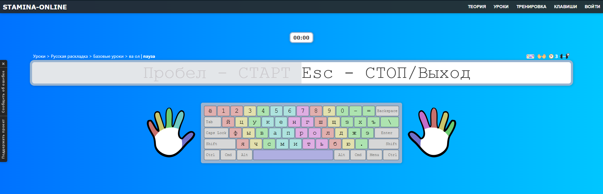 Чтобы измерять и увеличивать скорость набора текста используем онлайн-версию тренажёра Stamina. В окне программы отображается изображение клавиатуры, где разными цветами обозначены зоны для каждого пальца, что помогает при слепой печати. Для начальной тренировки можно использовать только четыре пальца. В процессе ввода подсказки будут выделяться красным.